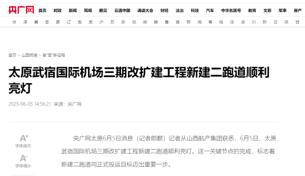 6月5日凌晨,太原武宿国际机场三期改扩建工程新建二跑道顺利亮灯。这一关键节点的完成,标志着新建二跑道向正式投运目标迈出重要一步。