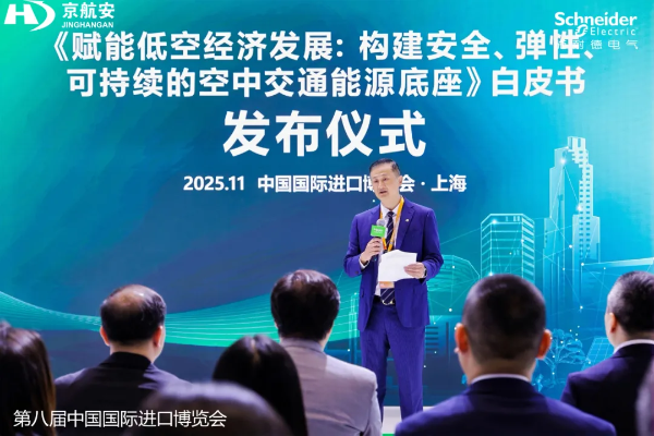 11月5日至10日,远东智慧能源股份有限公司(简称:远东股份,股票代码:600869)旗下的北京京航安机场工程有限公司(以下简称:京航安)首次以参展商身份亮相第八届中国国际进口博览会,并与全球能源管理与自动化领域数字化转型专家施耐德电气签署战略合作协议,共同发布《赋能低空经济发展:构建安全、弹性、可持续的空中交通能源底座》白皮书,携手助力民航产业绿色化、智慧化新未来。